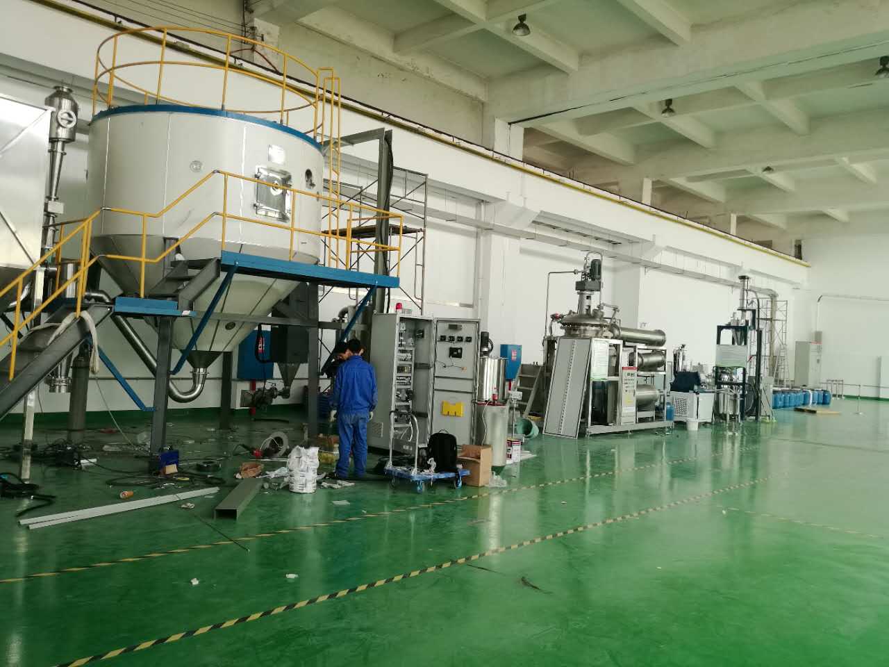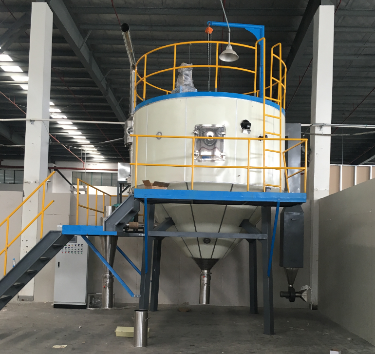 空氣經(jīng)過(guò)濾和加熱,進(jìn)入干燥器頂部空氣分配器,熱空氣呈螺旋狀均勻地進(jìn)入干燥室。料液經(jīng)塔體頂部的高速離心霧化器,(旋轉(zhuǎn))噴霧成極細(xì)微的霧狀液珠,與熱空氣并流接觸在極短的時(shí)間內(nèi)可干燥為成品。成品連續(xù)地由干燥塔底部和旋風(fēng)分離器中輸出,廢氣由風(fēng)機(jī)空。